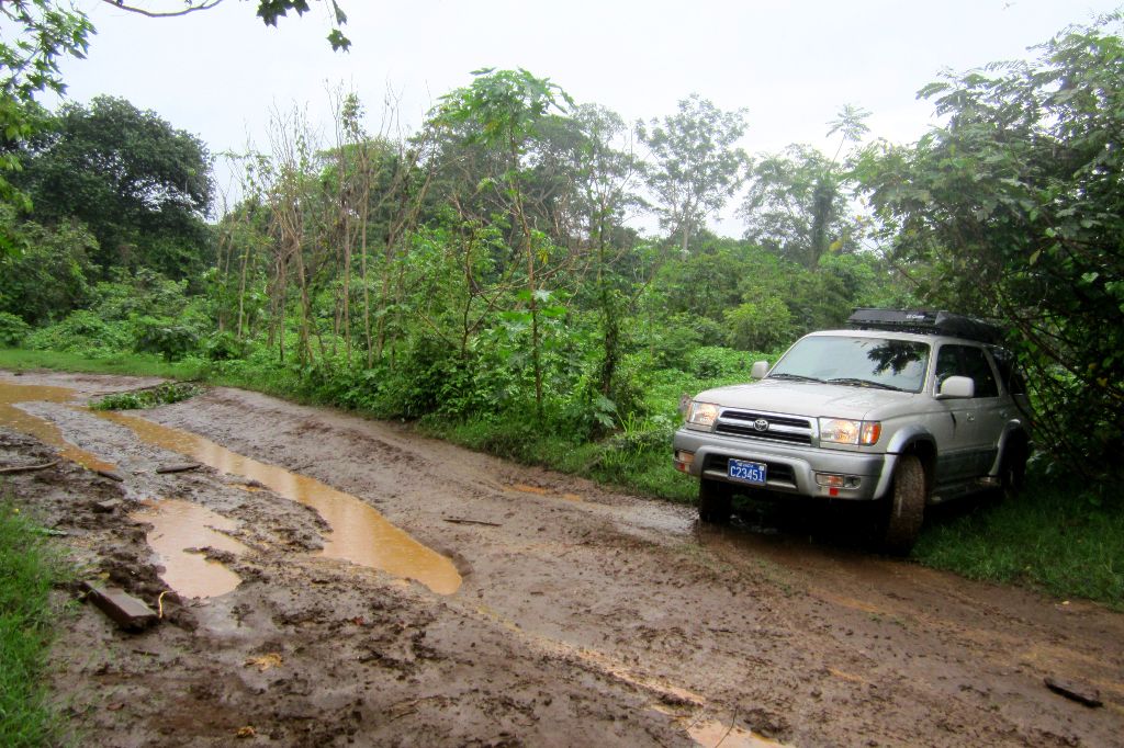When driving south from Nosara, the most direct route into Sámara crosses a river that has no bridges. Following directions from our open-source GPS maps, we end up on a suspicious-looking mud road, which indeed leads us to a river crossing. It’s pretty shallow and we cross with ease. However, as we continue down this “road” it quickly turns into a crazy swamp. After blasting through some mucky pits of death in 4WD, we reach some solid earth and stop. Amanda, in the driver’s seat, looks over at Travis. She is calm and collected, as if spinning tires in foot-deep mud is normal business. Travis gets out and does some reconnaissance ahead to see how fucked this road is. It’s fucked. Yes, we must turn around. Amanda turns Bruno around and I take this picture before we go back the way we came, through the pits off to the left.