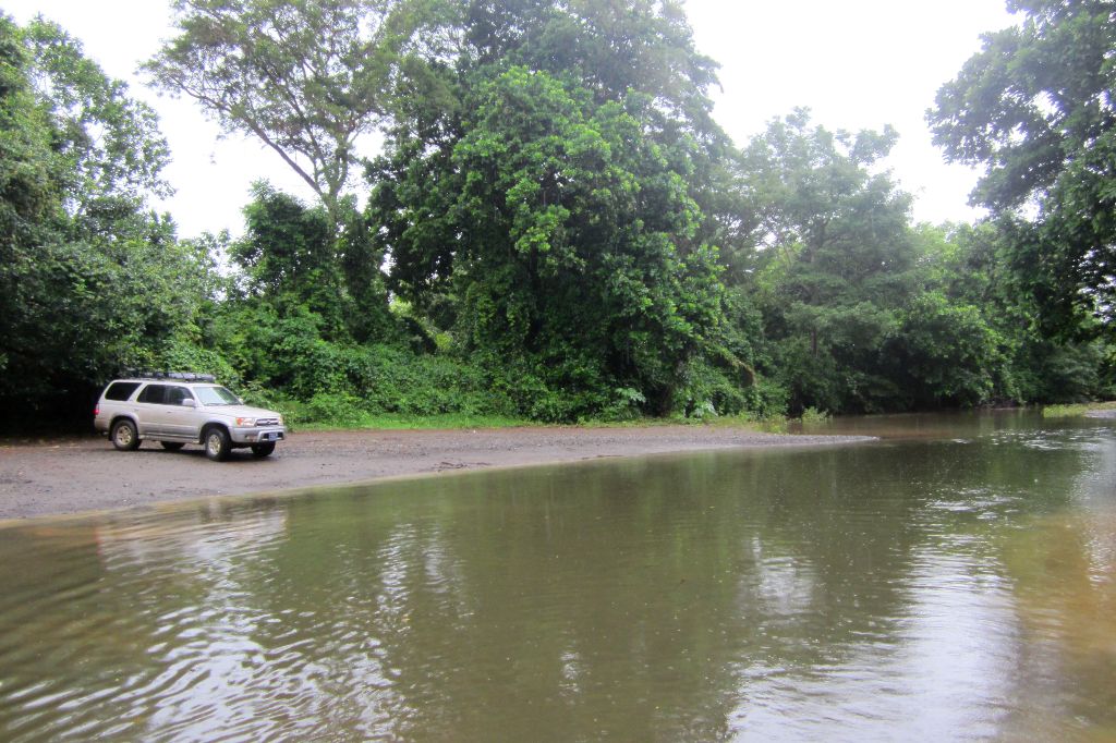 We head over to the alternate river crossing, which is in fact the “main road”. We wade in the river to check the depth and it’s at Travis’ knees, which is right at our comfort limit for river crossings, based on earlier internet research. During Bruno’s maintenance phase back in Oakland, we extended the rear differential breather to allow for crossing rivers in Costa Rica – and now here we are, in Costa Rica crossing rivers! So, the primary objective is to avoid getting water in the engine air intake under Bruno’s hood.